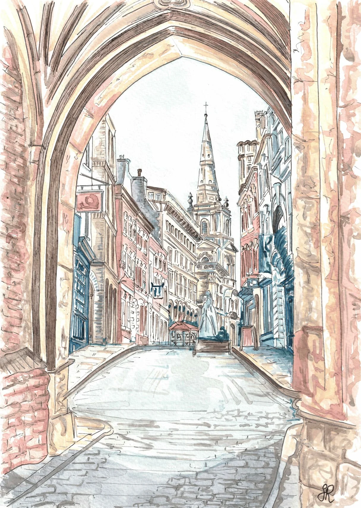 Working in pen, watercolour, and acrylic, she focuses on streets, rooftops, and buildings, with particular attention to light, colour, and structure. Susie works both on location and from her studio, using direct observation to capture the atmosphere of the places she draws and paints. A large part of her work is based on Bristol’s Old City, including paintings of Christmas Steps, St John’s Gate, St Nicholas Market, and Broad Street.